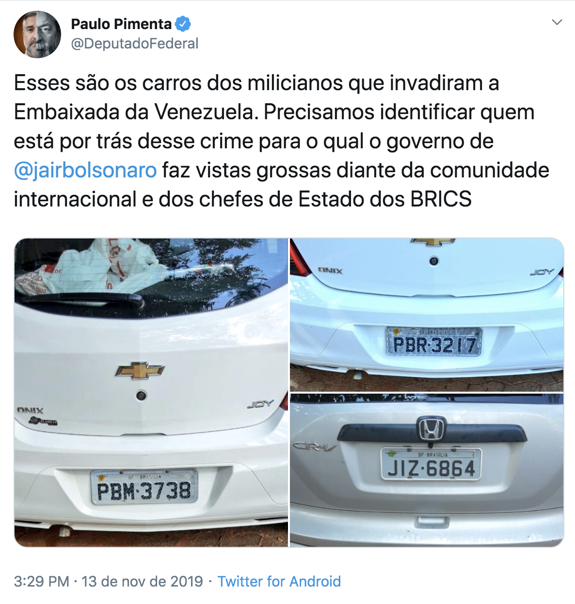 Por Renato Rovai e Gil Luiz Mendes - Um dos veículos utilizados na invasão da Embaixada da Venezuela em Brasília, nesta quarta-feira (13), pertence a Maria do Carmo Zinato. Em seu LinkedIn, ela se apresenta como arquiteta e presidente do Rotary Club de Brasília.