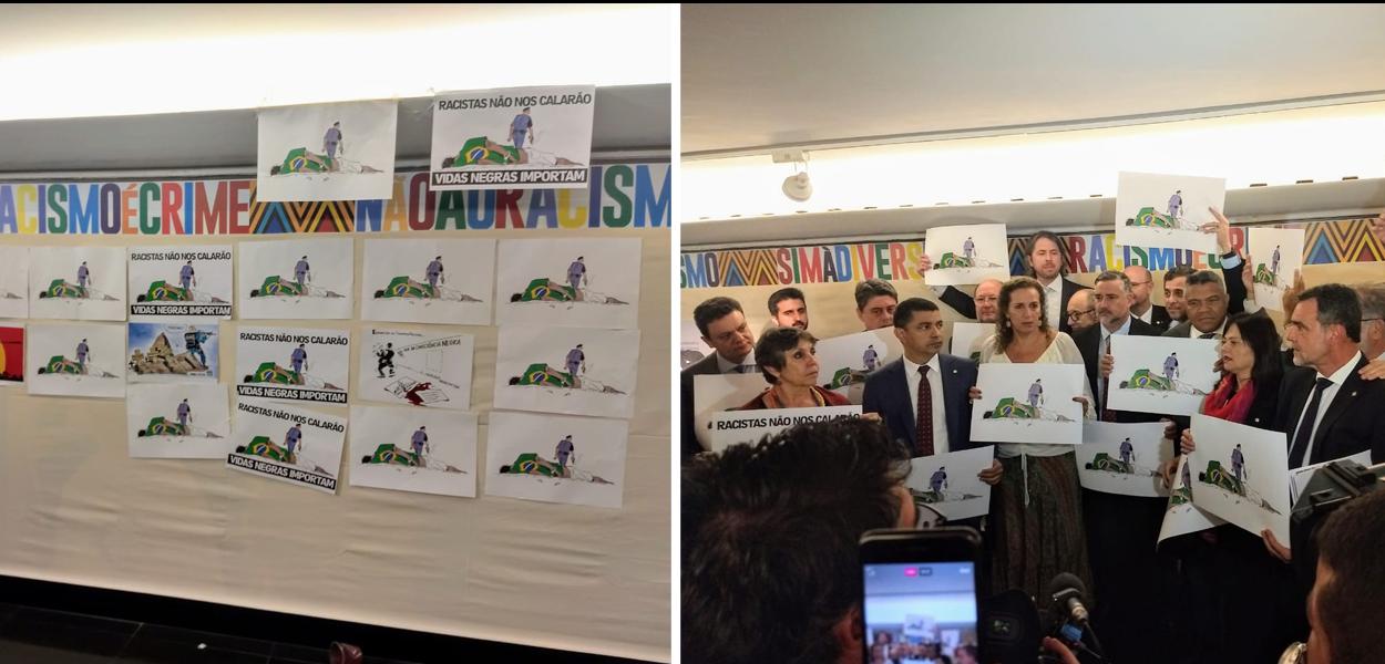 "Fascistas, racistas, não passarão", gritaram os deputados de oposição no mesmo local onde nesta terça uma placa da exposição pelo Dia da Consciência Negra foi destruída. Os parlamentares também recolocaram uma impressão da charge retirada (vídeos)