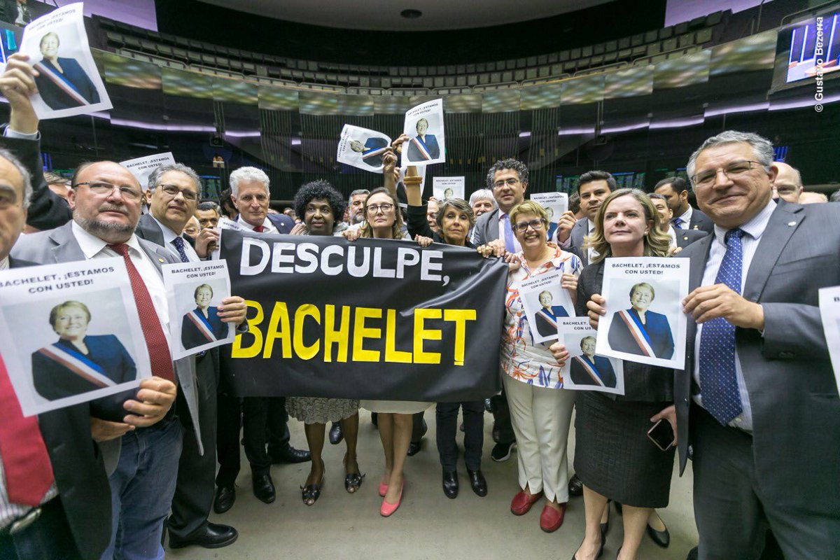 "Desculpe, Bachelet. Estamos com você", gritava a bancada do PT na Câmara dos Deputados na noite desta quarta-feira 3, junto de uma faixa que trazia a mesma mensagem. Os parlamentares repudiavam a declaração em que Bolsonaro elogiou a tortura e a morte do pai da ex-presidente do Chile pelo regime Pinochet