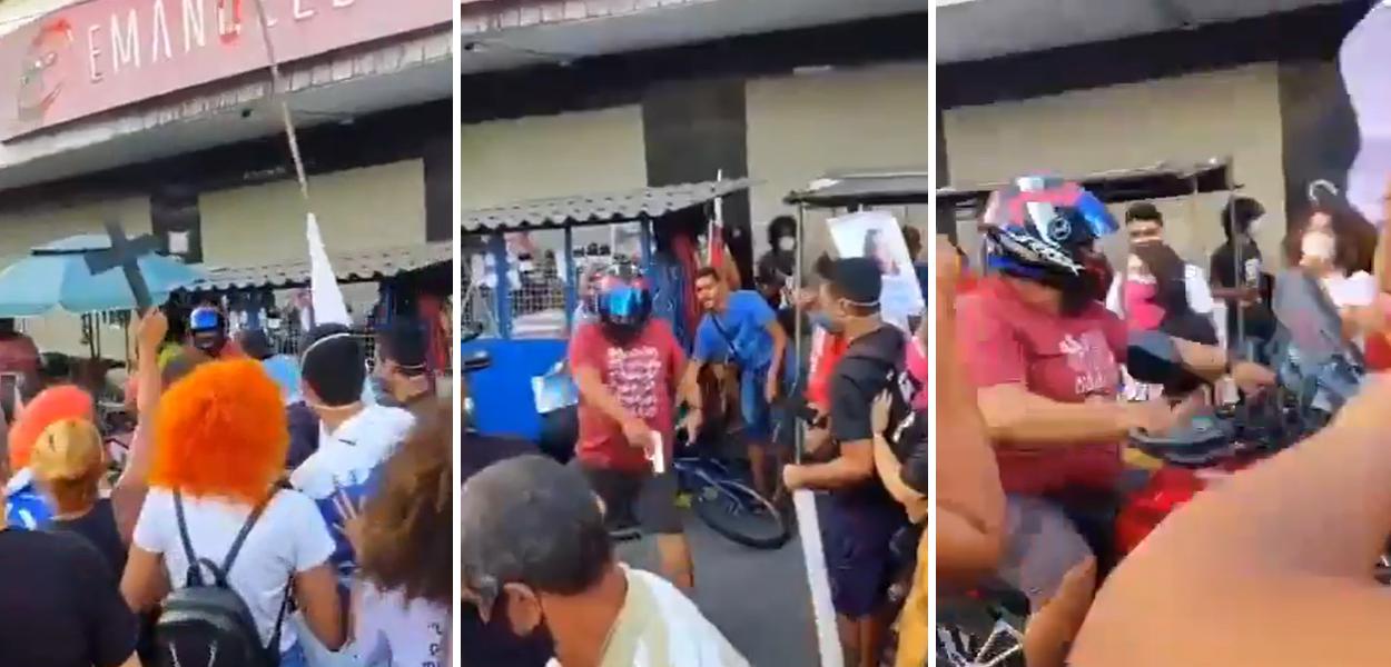 Nas imagens, é possível ver o homem invadindo o ato e apontado o revólver contra as manifestantes.