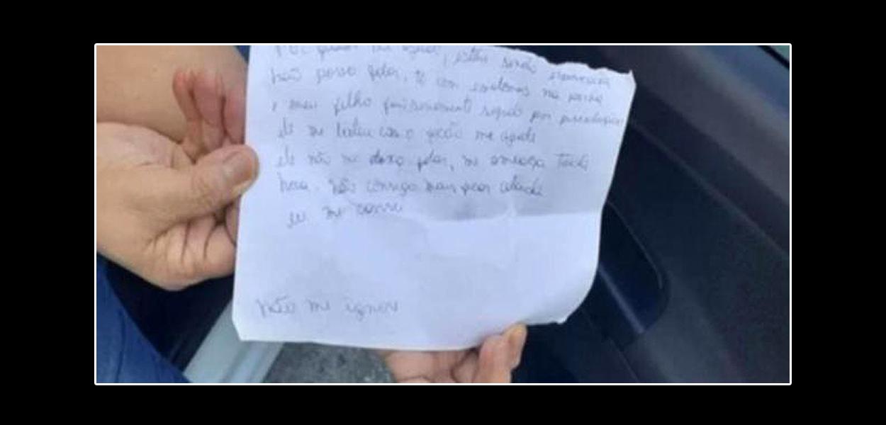 O bilhete traz a seguinte mensagem: "Por favor, me ajude. Estou sendo espancada. Não posso falar. Estou com hematomas na perna e meu filho foi seriamente sofrido (sic) por psicológico. Ele me bateu com o facão. Me ajude, ele não me deixa falar, me ameaça toda hora. Não consigo mais ficar calada, eu me cansei. Não me ignore."