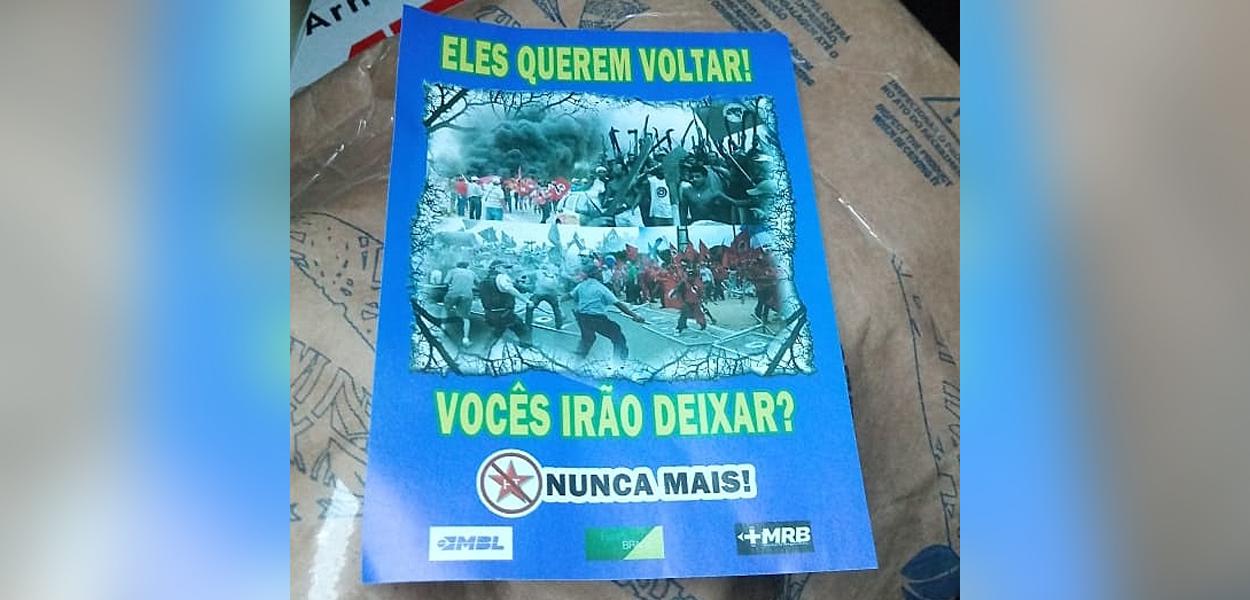 Panfleto assinado pelo MBL, Movimento Resgate Brasil (MRB) e outras organizações de direita, traz fotos do Movimento dos Trabalhadores Rurais Sem Terra (MST) e a frase: "Eles querem voltar! Vocês irão deixar? PT nunca mais"