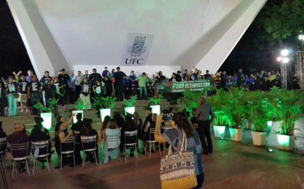 Durante colação de grau dos formandos da Universidadee Federal do Ceará (UFC) do segundo semestre de 2019, realizada nesta terça-feira, estudantes e sindicatos de docentes protestaram contra o...