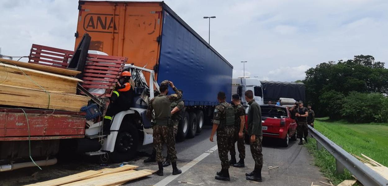 Um acidente entre caminhões interditou a Dutra por quase 2h no trecho de Jacareí (SP). Após a batida, uma vítima ficou presa nas ferragens