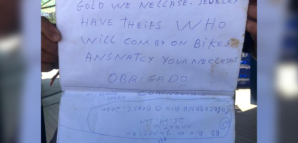 247 - Um ambulante, em Copacabana, Rio de Janeiro, escreveu um aviso, em inglês, para os turistas tomarem cuidado com seus pertences, em especial ouro, joias e colares, pois podem vir ladrões de bicicleta. A informação é do jornalista Ancelo Gois, em sua coluna no jornal O Globo.