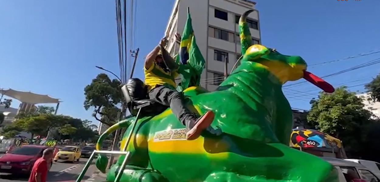Bolsonarista vai ao lançamento da candidatura de Bolsonaro montado em estátua de boi: "somos gados patriotas"(vídeo)
