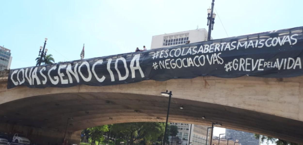 Eles estenderam uma enorme faixa no Viaduto do Chá, no centro, com os dizeres “Covas genocida”, em alusão ao prefeito do PSDB. O ato aconteceu em frente à sede da Prefeitura de São Paulo.
