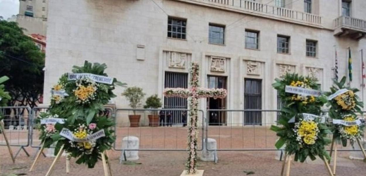 Contra aulas presenciais, professores depositam coroas de flores na Prefeitura de SP