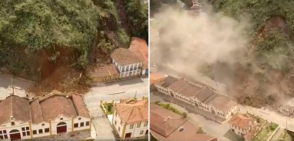 Imagens captaram o momento exato em que parte de um morro cedeu e atingiu casarões na cidade histórica. Minas sofre há dias com intensas chuvas