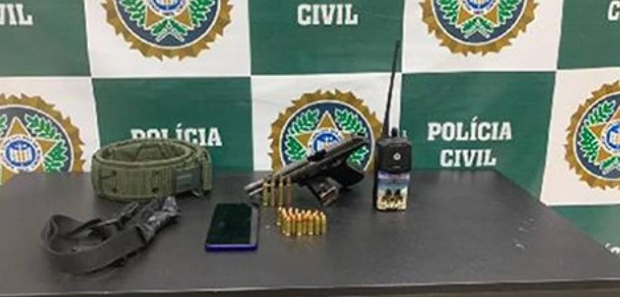 Ele foi detido com uma pistola calibre 9mm, munições calibres 9mm e 223mm, um radiotransmissor e um caderno com anotações do tráfico.