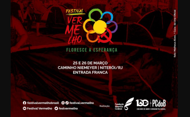 Gratuito, o Festival Vermelho é realizado pelo PCdoB e a Fundação Maurício Grabois. Serão mais de 20 atrações musicais, divididas entre dois palcos no belo espaço do Caminho Niemeyer, às margens da Guanabara e com grande estrutura para receber as caravanas de diversos estados e o público em geral do Rio de Janeiro.