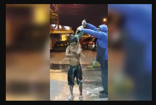 O registro foi feito no início da semana. O frentista que estava agasalhado devido à noite fria, esfregava o homem com sabão e uma esponja.
