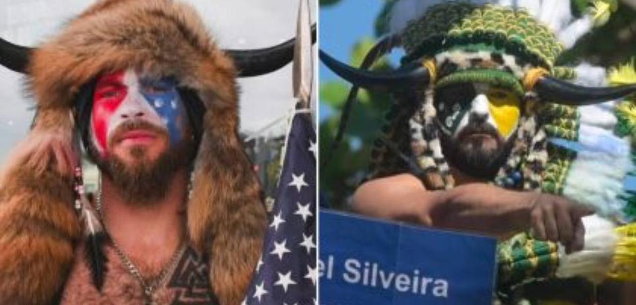 Se trata de um homem que usava chifres, peles e um cocar indígena com o rosto pintado de verde e amarelo, fazemdo uma alusão a Jacob Anthony Chansley, conhecido como “Jake Angeli”, preso e condenado pela invasão do Capitólio.