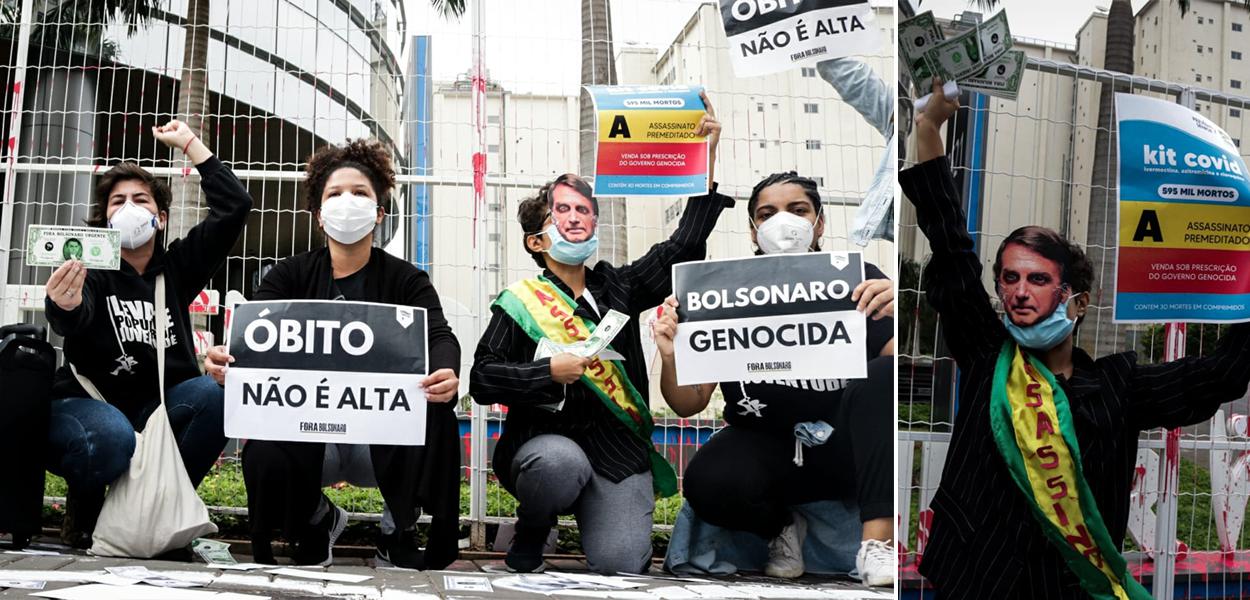 Com cartazes e tintas, a entidade diz "denunciar o sangue derramado nas mortes que poderiam ter sido evitadas", além de criticar Jair Bolsonaro.