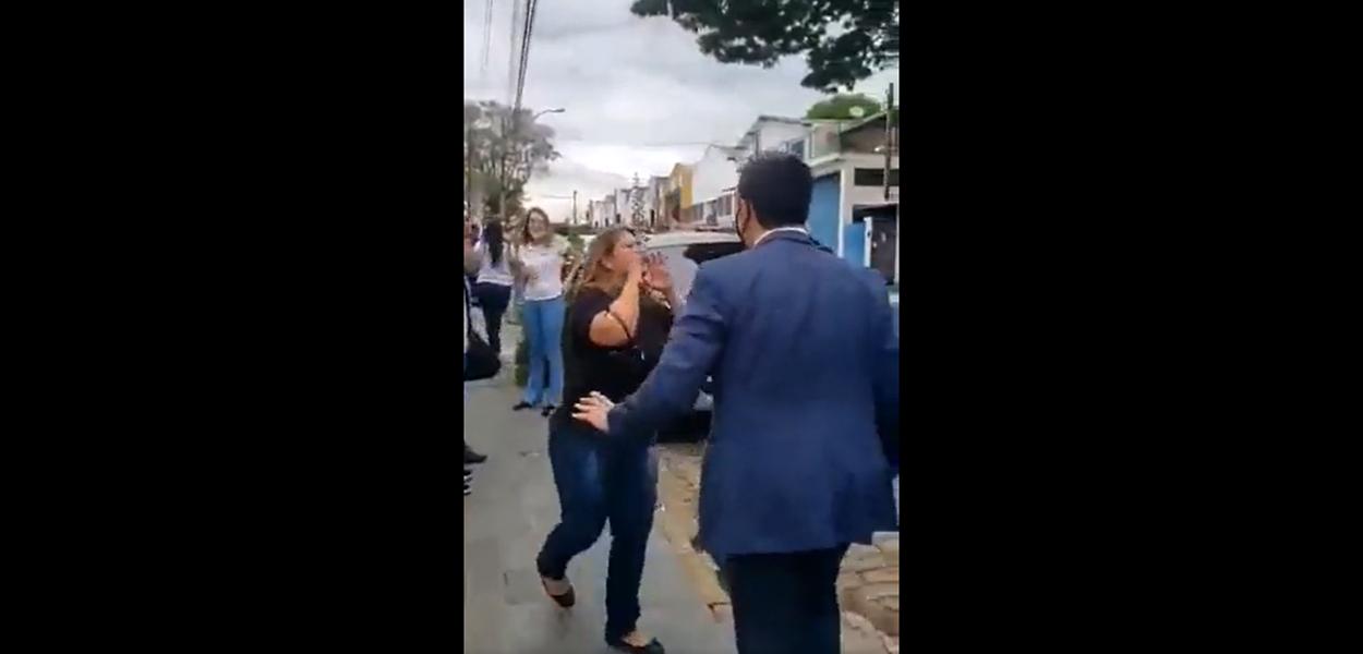 No vídeo, que viralizou nas redes, a mulher, visivelmente irritada, foi contida pelos seguranças do tucano.