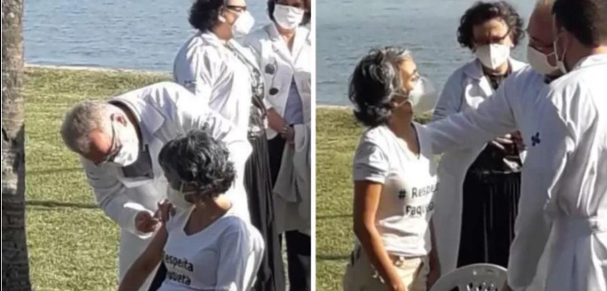 "Estou feliz por estar vacinada, mas não queria ser vacinada por você. Queria ser vacinada por ela", afirmou a diretora da associação de moradores local, apontando para Margareth Dalcomo, pesquisadora da Fundação Oswaldo Cruz (Fiocruz).