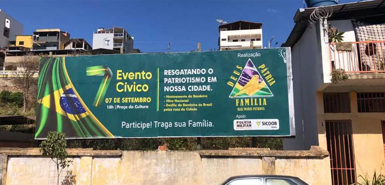 247 - Um outdoor convocando a população para o que classifica como um “ato cívico” no dia 7 de setembro foi instalado na cidade de Raul Soares, na Zona da Mata, com um logo que indica que a Polícia Militar de Minas Gerais (PM-MG) apoia a manifestação. A reportagem é do portal O Tempo.