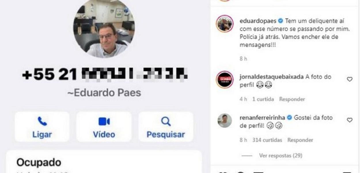 O caso foi revelado pelo próprio Paes nas redes sociais, na tarde desta terça-feira. "Tem um delinquente aí com esse número se passando por mim", escreveu ele, ao lado de uma reprodução que traz a linha telefônica do Rio que seria utilizada pelo golpista. "Polícia já atrás", acrescentou o prefeito, que até pediu, em tom de piada, para que os seguidores contassem o falso perfil: "Vamos encher ele de mensagens!"