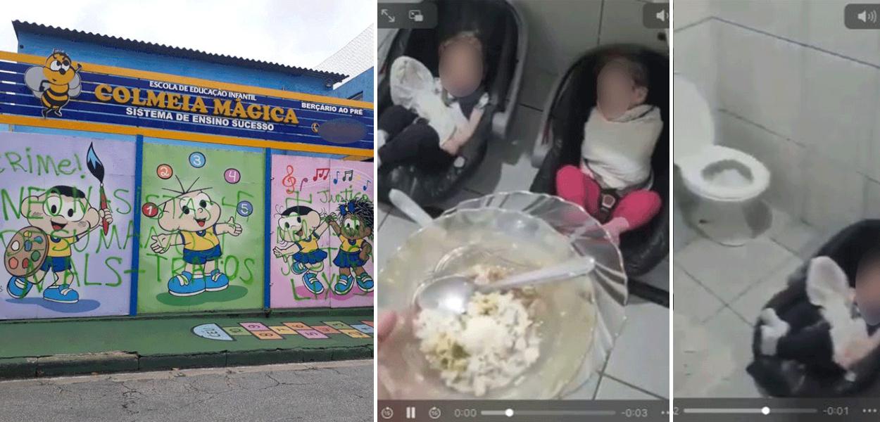 Vídeos que circulam nas redes sociais mostram pelo menos quatro crianças chorando amarradas, com os braços presos por panos, como se estivessem imobilizadas por ‘camisas de força’. Em uma das gravações, as crianças estão dentro de um banheiro, sentadas em cadeirinhas de bebês, no chão, embaixo de uma pia e próximas ao vaso sanitário.