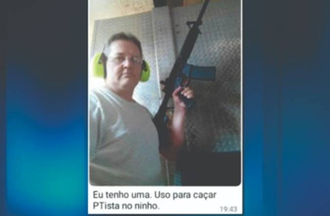 Fórum - O presidente do PSL de Piraju (SP), Alfrânio Alves Martins, postou uma foto em um grupo de WhatsApp em que aparece armado, com a seguinte frase: “Eu tenho uma. Uso para caçar PTista no ninho“.
