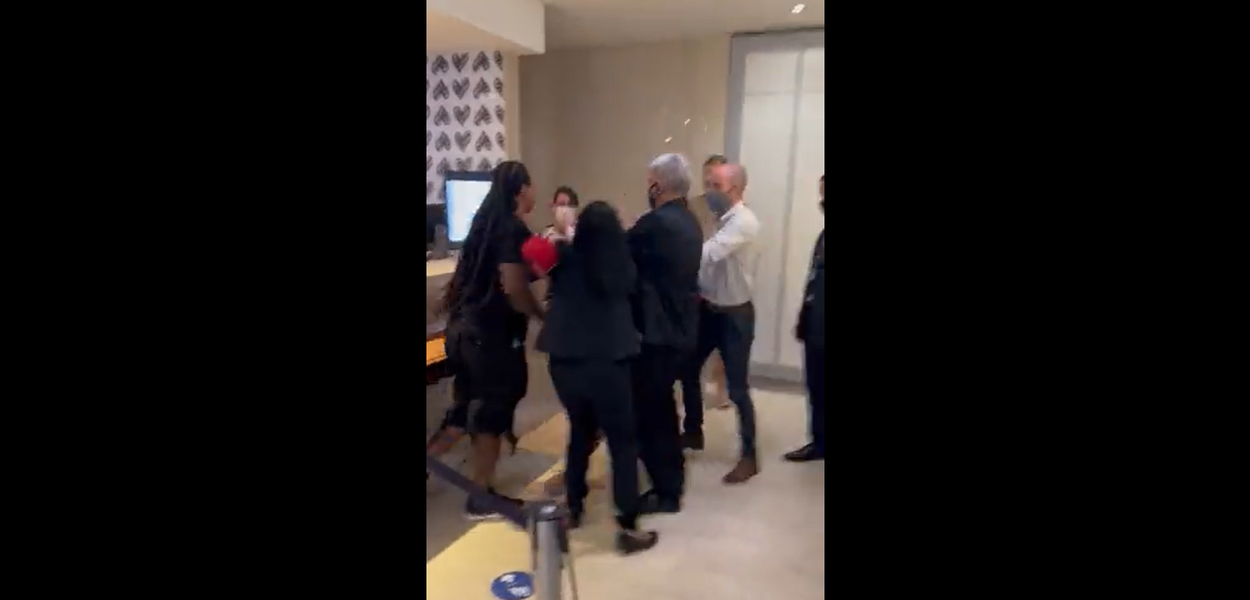 Imagens mostram momento em que mulher agride H.L. Thompson, que revida; casal teria ficado incomodado com atendimento prioritário ao homem