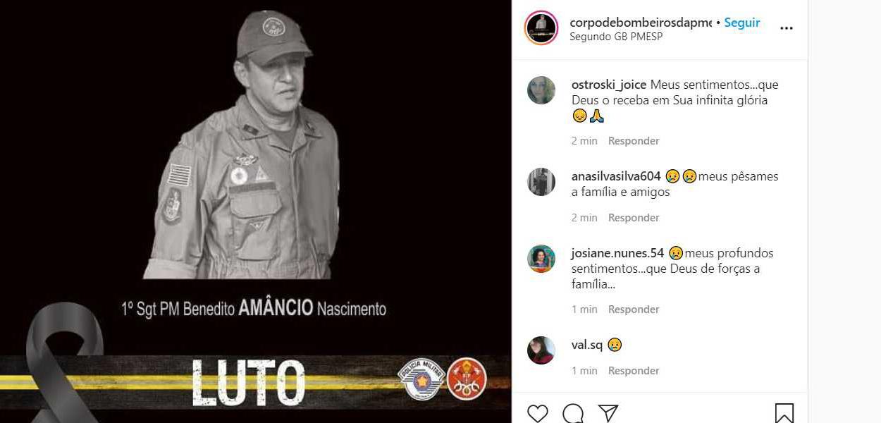 247 - O sargento da Corpo de Bombeiros Benedito Amâncio Nascimento faleceu vítima do novo coronavírus, sendo o terceiro policial militar da ativa a morrer vítima da covid-19 em São Paulo.
