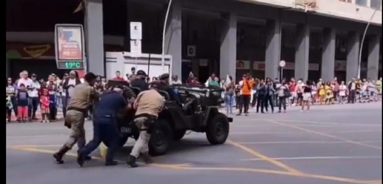 Um carro que desfilava durante a parada de 7 de setembro na cidade de Niterói, na manhã desta quarta-feira, estragou e teve que seguir pela avenida empurrado pelos oficiais que marchavam no local.