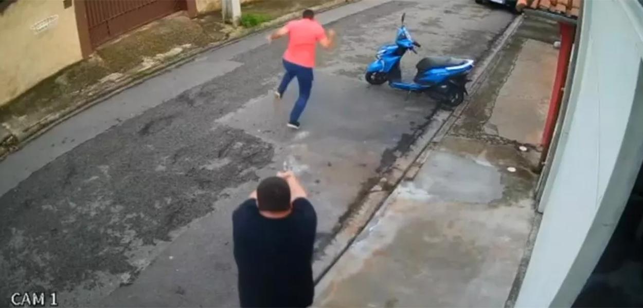 Fabiano agrediu o homem, que estava armado e fez vários disparos. Uma câmera de segurança flagrou a briga dos dois, que aconteceu por volta das 18h na casa do comerciante Júnior Humberto de Oliveira no bairro Jardim Imperial