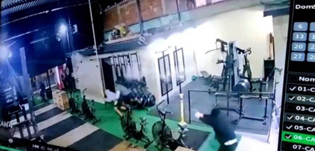 247 - Imagens de câmeras de segurança flagram o momento em que dois homens armados invadem uma academia e atiraram contra policiais militares em Nova Iguaçu, na Baixada Fluminense,. O crime aconteceu em 30 de junho.