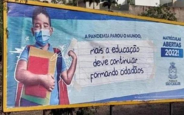A peça publicitária, que leva o logo da Prefeitura de São Carlos, confunde o uso das palavras "mais" e "mas"