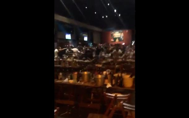 As cenas mostram agressões físicas entre homens e mulheres. Idosos e crianças também estavam no estabelecimento no momento da confusão