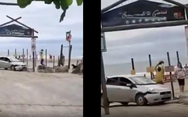 Após um casal entrar numa praia de carro, em Peruíbe (SP), e ter o veículo apedrejado por moradores insatisfeitos, a motorista do carro colidiu o automóvel ao tentar atropelar o autor das agressões