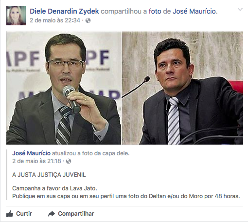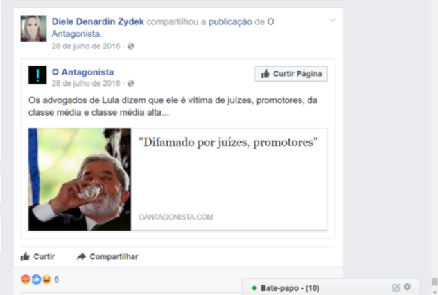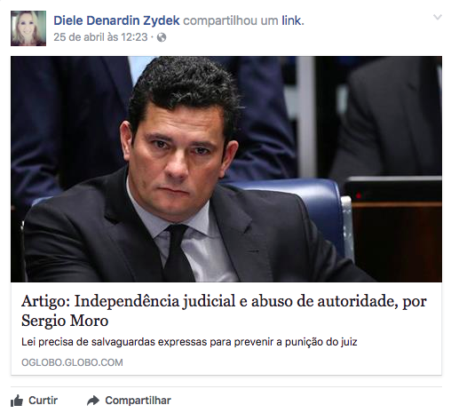 PS: O Facebook da juíza Diele Denardin Zydek tem compartilhamentos de diversas matérias elogiosas a Moro e o MPF e algumas do site de extrema direita O Antagonista: